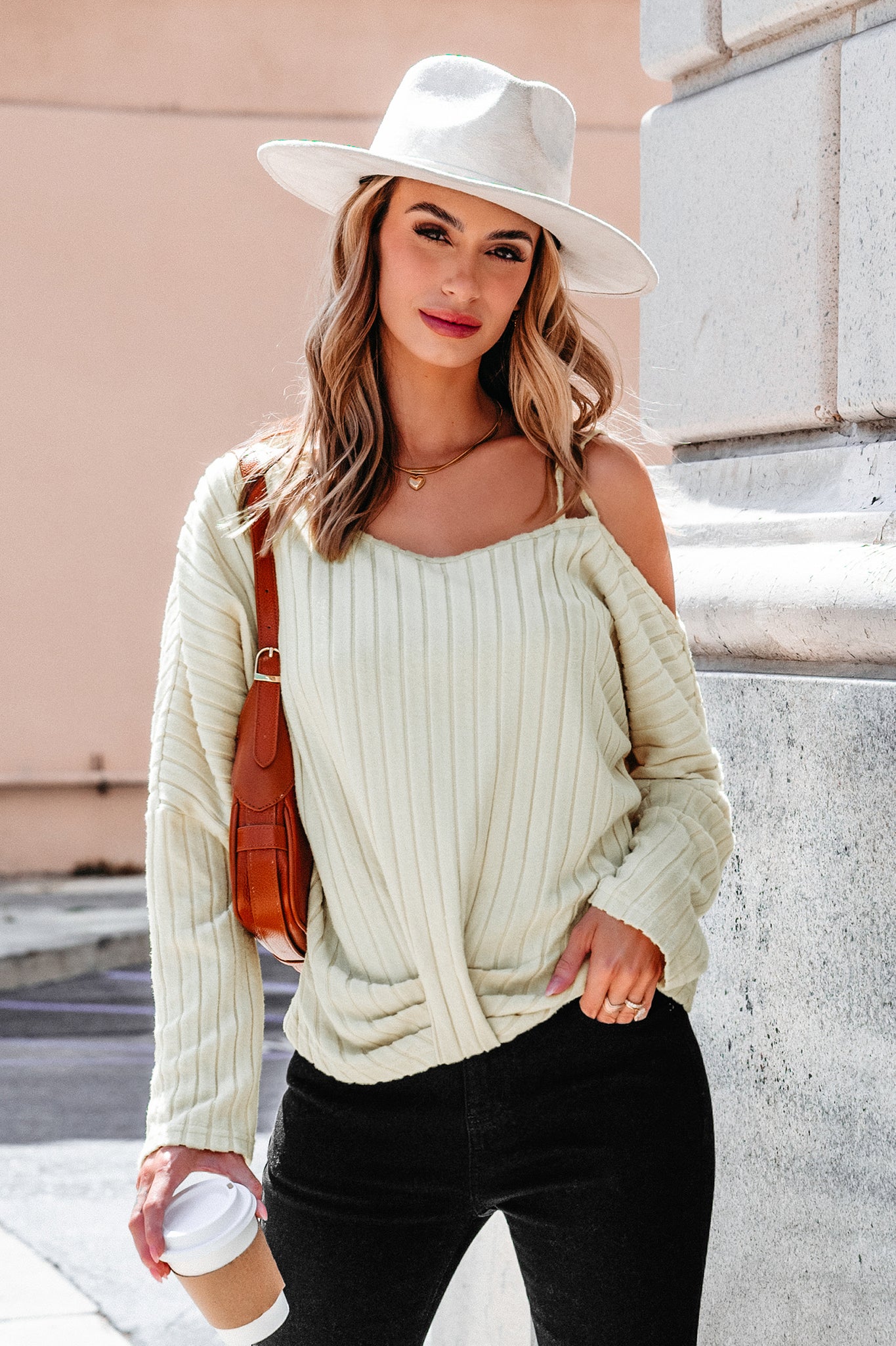Aprikosenfarbenes geripptes asymmetrisches Langarm-Cutout-Top