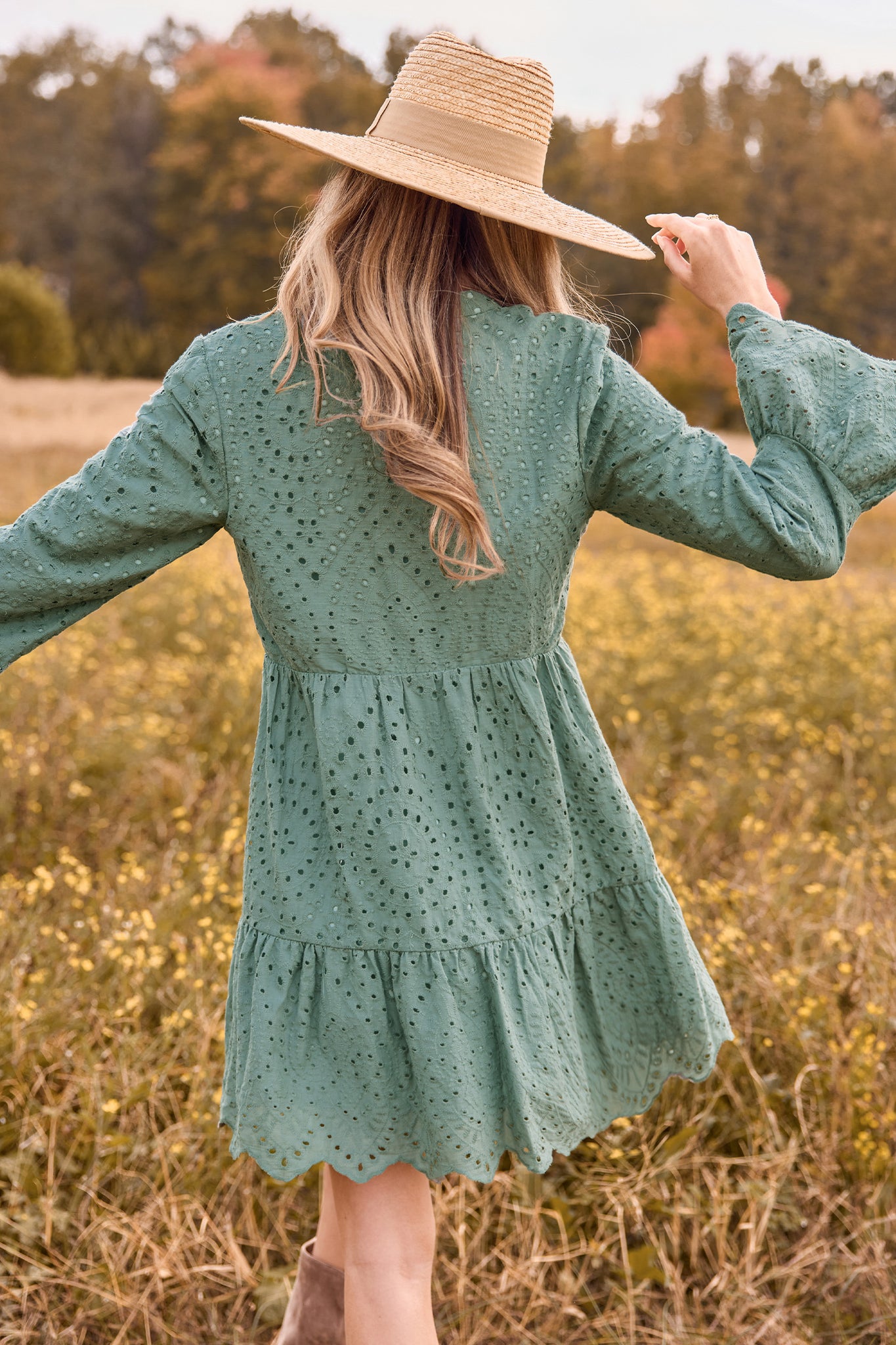Aquafarbenes Baumwollkleid mit ausgestellten Ärmeln und Ösen