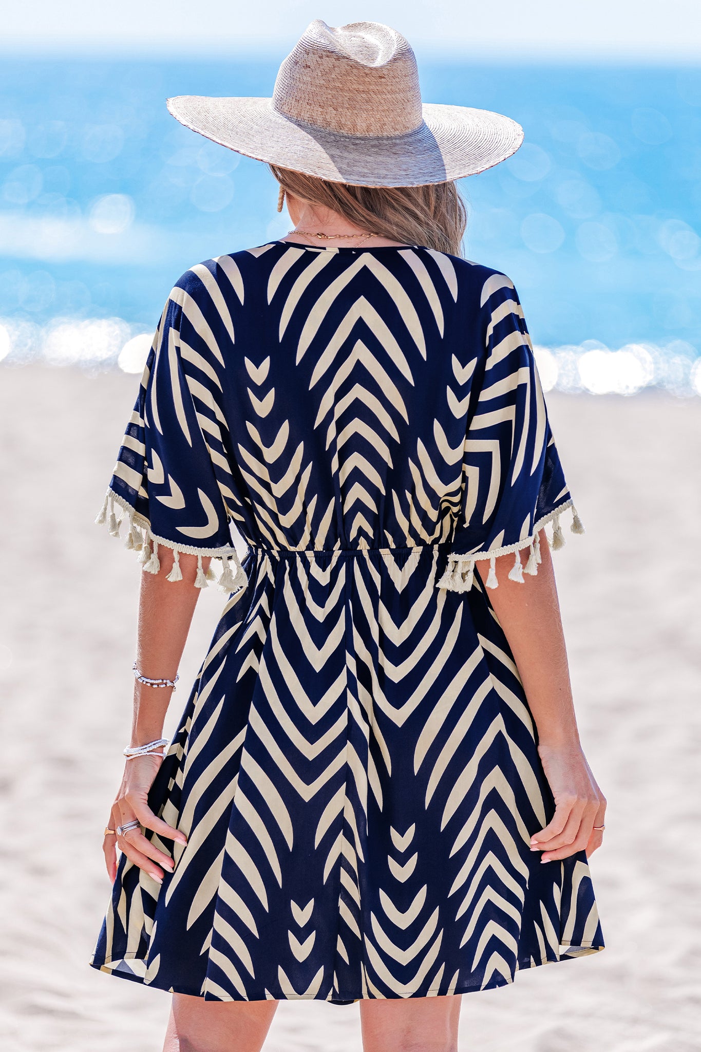 Abstraktes V-Ausschnitt Minikleid mit Spitzenbesatz
